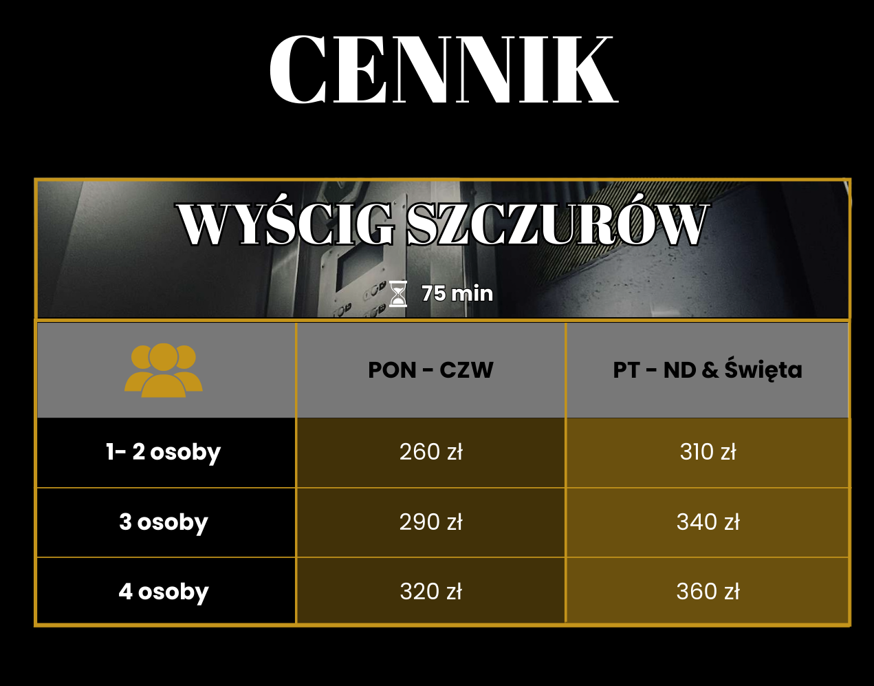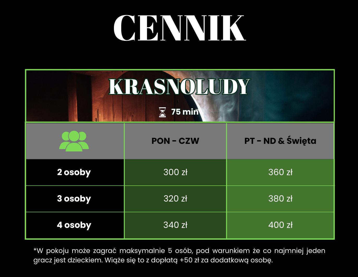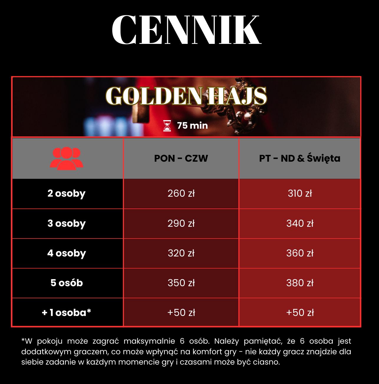 Uwaga! Jeśli dodatkowy gracz wykracza poza dopuszczalną liczbę osób w pokoju, Golden Hajs i In da Club za dodatkową opłatą 50 zł może wejść 6 osoba. W pokoju Krasnoludy może wejść dodatkowa 5 osoba za dopłatą 50 zł pod warunkiem, że w grupie znajduje się przynajmniej jedno dziecko. Do pokoju Wyścig Szczurów nie ma możliwości żeby weszła dodatkowa osoba.