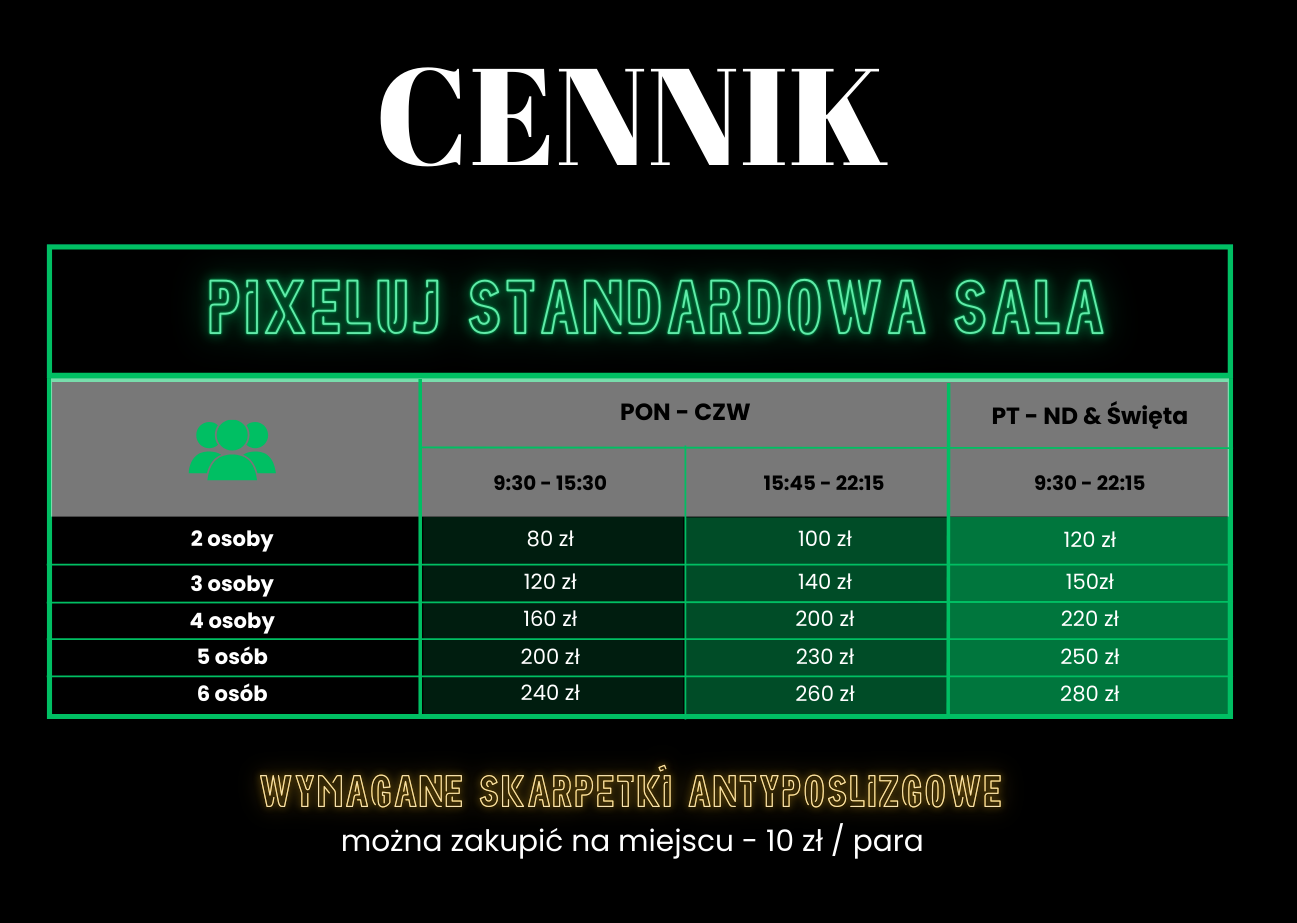 U nas godzina to 60 minut czystej zabawy (chyba że się spóźnicie – wtedy czas ulega skróceniu). Jeśli po Waszym slocie sala jest wolna, możecie przedłużyć grę o kolejne 60 minut lub o dodatkowe 30 minut (za 50% stawki godzinowej).