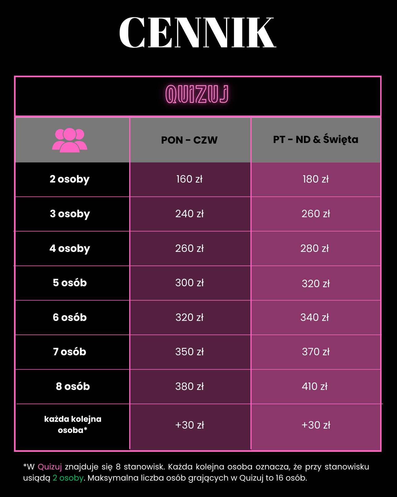 Uwaga: Do sal Quizuj obowiązuje całkowity zakaz wnoszenia napojów i jedzenia. Dbamy o profesjonalny sprzęt i czułą elektronikę pulpitów. Zapraszamy do baru (w lokalizacji Malta) przed lub po rozgrywce.